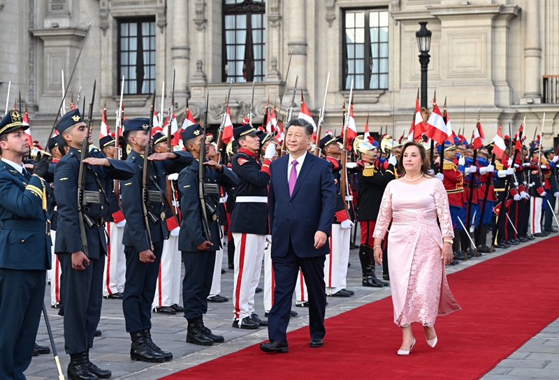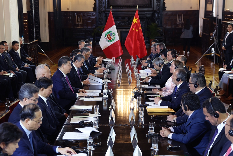 习近平指出,这是我第三次访问秘鲁,也是一年时间里第三次同总统女士会晤。许多秘鲁民众自发聚集道路两旁,挥手致意表示欢迎,让我深切感受到秘鲁人民对中国人民的友好情谊。中秘同为文明古国。古老文明的深厚积淀,赋予中秘两国智慧和胸怀,让我们能够看清历史前进方向,顺应时代发展潮流,始终坚持平等相待、互尊互信、互学互鉴,成为不同体量、不同制度、不同文化国家团结合作的典范。建交53年来,特别是我2016年对秘鲁进行首次国事访问以来,在双方共同努力下,中秘贸易投资合作快速增长,为两国人民带来实实在在的利益。双方要总结经验,推动两国务实合作提质升级,使中秘全面战略伙伴关系不断迈上新台阶,更好造福两国人民。