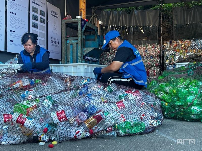 小蓝之家内,工作人员分拣、处理塑料瓶。